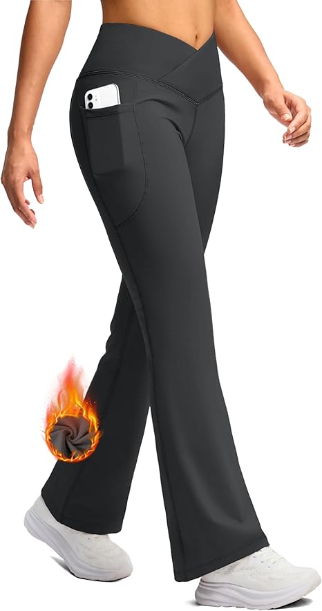 Women's Fleece Lined Pants with Pockets Crossover Yoga Pants 28.5"/30.5"/32" Thermal Warm Flare Leggings for Women