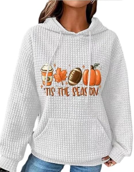 Women's Pullover Sweatshirt Drawstring Tis The Season Pumpkin Printed Waffle Hoodie Long Sleeve Tops with Pocket