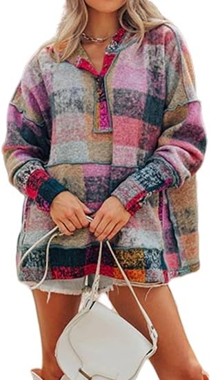 Women's Oversized Flannel Plaid Button Dwon Long Sleeve Pullover Hoodie Fall Winter Warm Sweatshirts Outwear