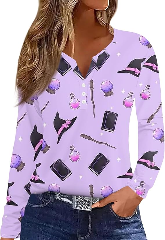 Women's Halloween Pattern T-Shirt - Cute Pumpkin Print V-Neck Women's Long Sleeved Autumn Shirt - Halloween Top